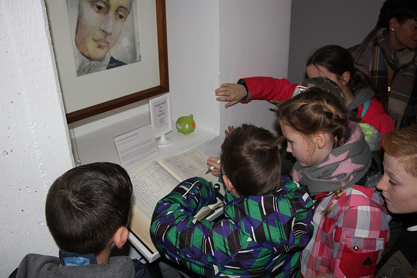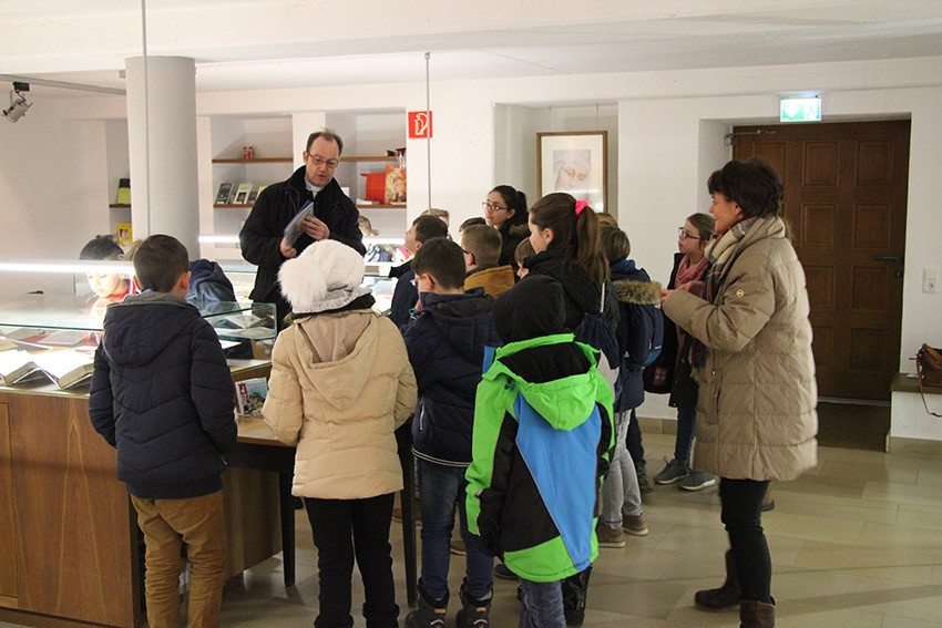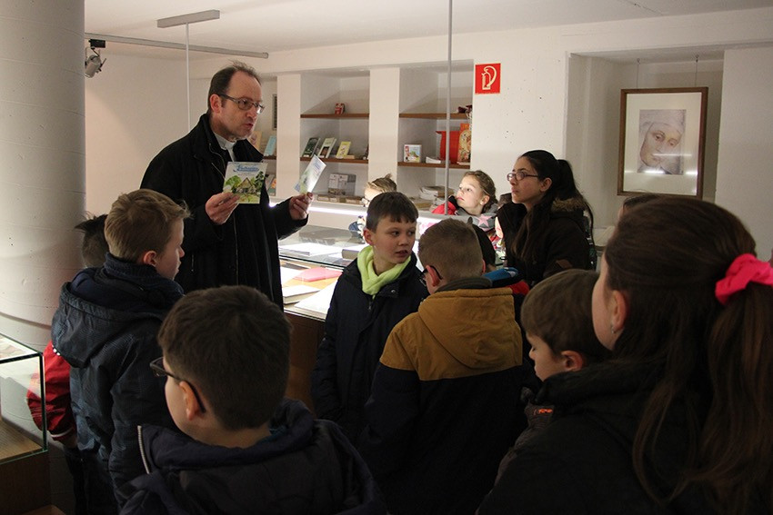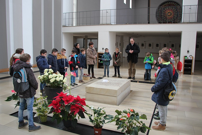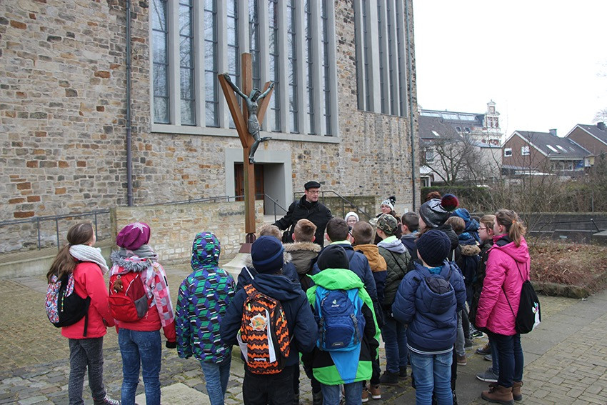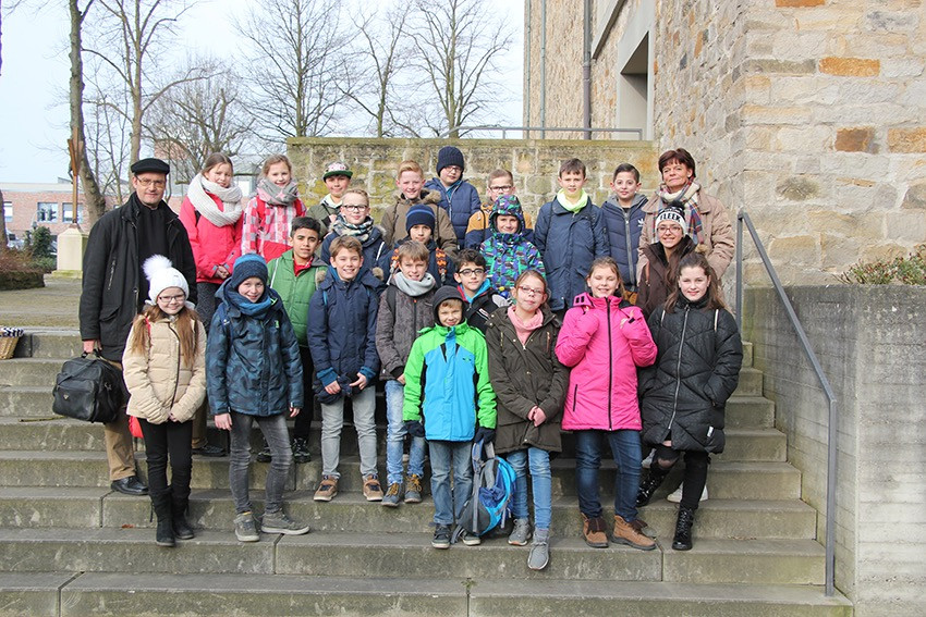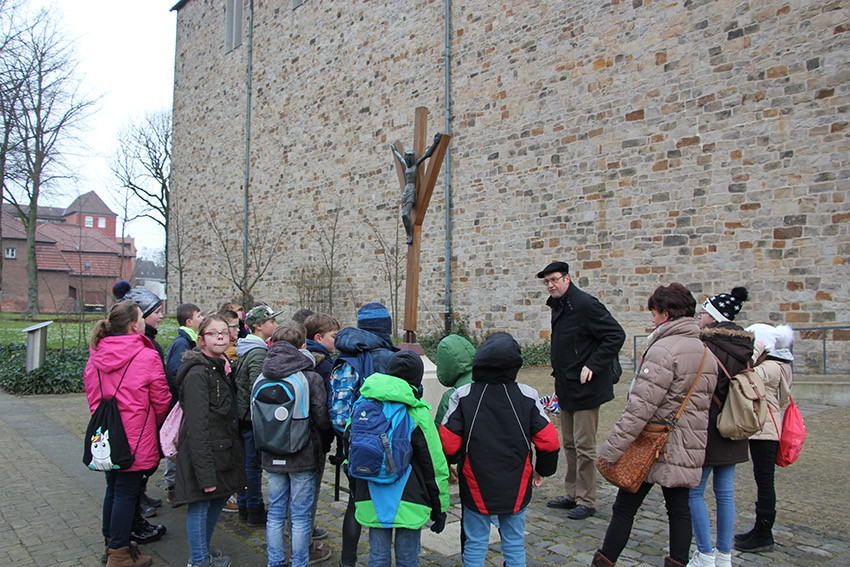 Spannende Eindrücke und Informationen konnten in diesen Tagen die Viertklässler der Anna-Katharina-Emmerick-Grundschule sammeln: Jeweils einen ganzen Vormittag lang begab sich jede Klasse auf die Spuren der Dülmener Seligen Anna Katharina Emmerick. „Die Kinder müssen wissen, wer sich hinter dem Kürzel AKE verbirgt“, meint Ulrike Eistrup, Klassenlehrerin der 4b. Begleitet wurden die Projekttage durch Pfarrer Markus Trautmann. Nach einem lebendigen Einstieg und Austausch bei einem Bildervortrag wurde das Emmerick-Lied eingeübt. Dann ging es zu Fuß durch die Innenstadt, vorbei am Nonnenturm, zur Kreuzkirche. Die Emmerick-Gedenkstätte ließ in eine ferne Zeit eintauchen, und doch wurde das Leben der Schulpatronin durch Bilder und Exponate sehr anschaulich. Warum ist die Emmerick bis heute ein Vorbild? „Weil sie Mitleid zeigte mit anderen Menschen“, meint eine Schülerin. „Und sie nahm sich Zeit zum Zuhören und Beten“, ergänzt ein Junge. Im Anschluss der Führung bastelten die Jungen und Mädchen im Pfarrheim Heilig Kreuz kleine Laternen mit transparenten Emmerick-Motiven: Anna Katharina hatte Ausstrahlung und machte das Leben vieler Menschen hell. „Vorbilder sind für unser Miteinander heute wichtiger denn je“, findet Ulrike Austrup, „auch über Religionsgrenzen hinweg.“ Einen bewegenden Abschluss bildete der Gang zum Emmerick-Grab, wo die Kinder eigene Fürbitt-Zettel beschrieben und der Seligen „ans Herz“ legten. Vor dem Rückmarsch zur Schule ertönte kraftvoll das frisch gelernte Emmerick-Lied.