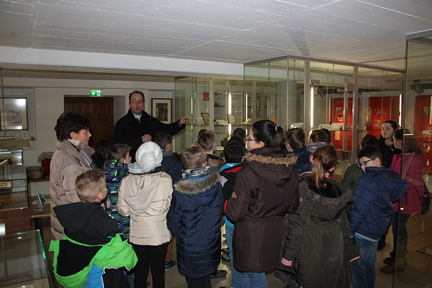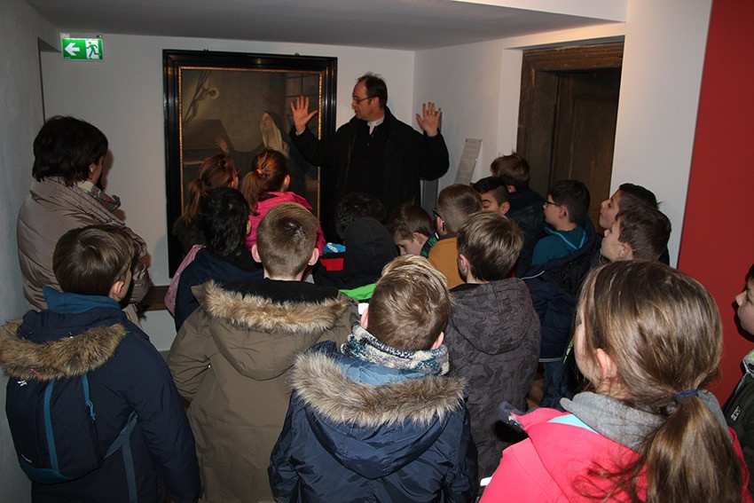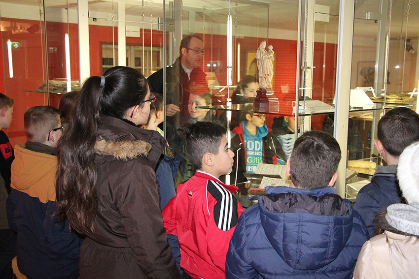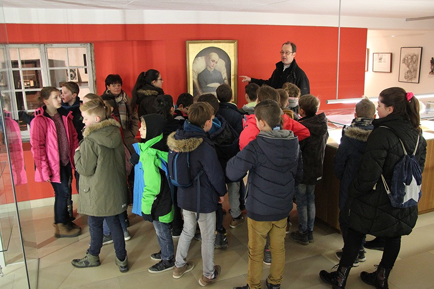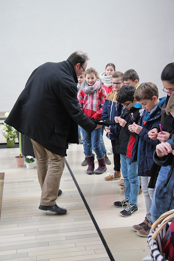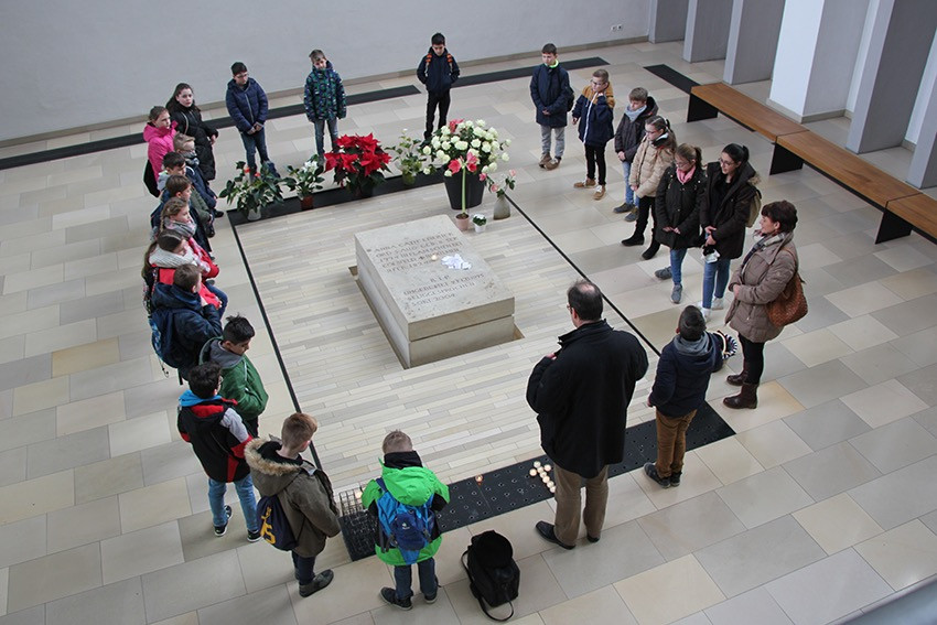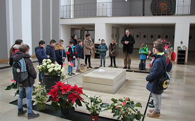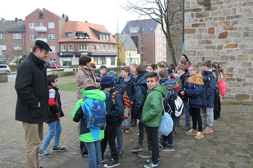 Spannende Eindrücke und Informationen konnten in diesen Tagen die Viertklässler der Anna-Katharina-Emmerick-Grundschule sammeln: Jeweils einen ganzen Vormittag lang begab sich jede Klasse auf die Spuren der Dülmener Seligen Anna Katharina Emmerick. „Die Kinder müssen wissen, wer sich hinter dem Kürzel AKE verbirgt“, meint Ulrike Eistrup, Klassenlehrerin der 4b. Begleitet wurden die Projekttage durch Pfarrer Markus Trautmann. Nach einem lebendigen Einstieg und Austausch bei einem Bildervortrag wurde das Emmerick-Lied eingeübt. Dann ging es zu Fuß durch die Innenstadt, vorbei am Nonnenturm, zur Kreuzkirche. Die Emmerick-Gedenkstätte ließ in eine ferne Zeit eintauchen, und doch wurde das Leben der Schulpatronin durch Bilder und Exponate sehr anschaulich. Warum ist die Emmerick bis heute ein Vorbild? „Weil sie Mitleid zeigte mit anderen Menschen“, meint eine Schülerin. „Und sie nahm sich Zeit zum Zuhören und Beten“, ergänzt ein Junge. Im Anschluss der Führung bastelten die Jungen und Mädchen im Pfarrheim Heilig Kreuz kleine Laternen mit transparenten Emmerick-Motiven: Anna Katharina hatte Ausstrahlung und machte das Leben vieler Menschen hell. „Vorbilder sind für unser Miteinander heute wichtiger denn je“, findet Ulrike Austrup, „auch über Religionsgrenzen hinweg.“ Einen bewegenden Abschluss bildete der Gang zum Emmerick-Grab, wo die Kinder eigene Fürbitt-Zettel beschrieben und der Seligen „ans Herz“ legten. Vor dem Rückmarsch zur Schule ertönte kraftvoll das frisch gelernte Emmerick-Lied.