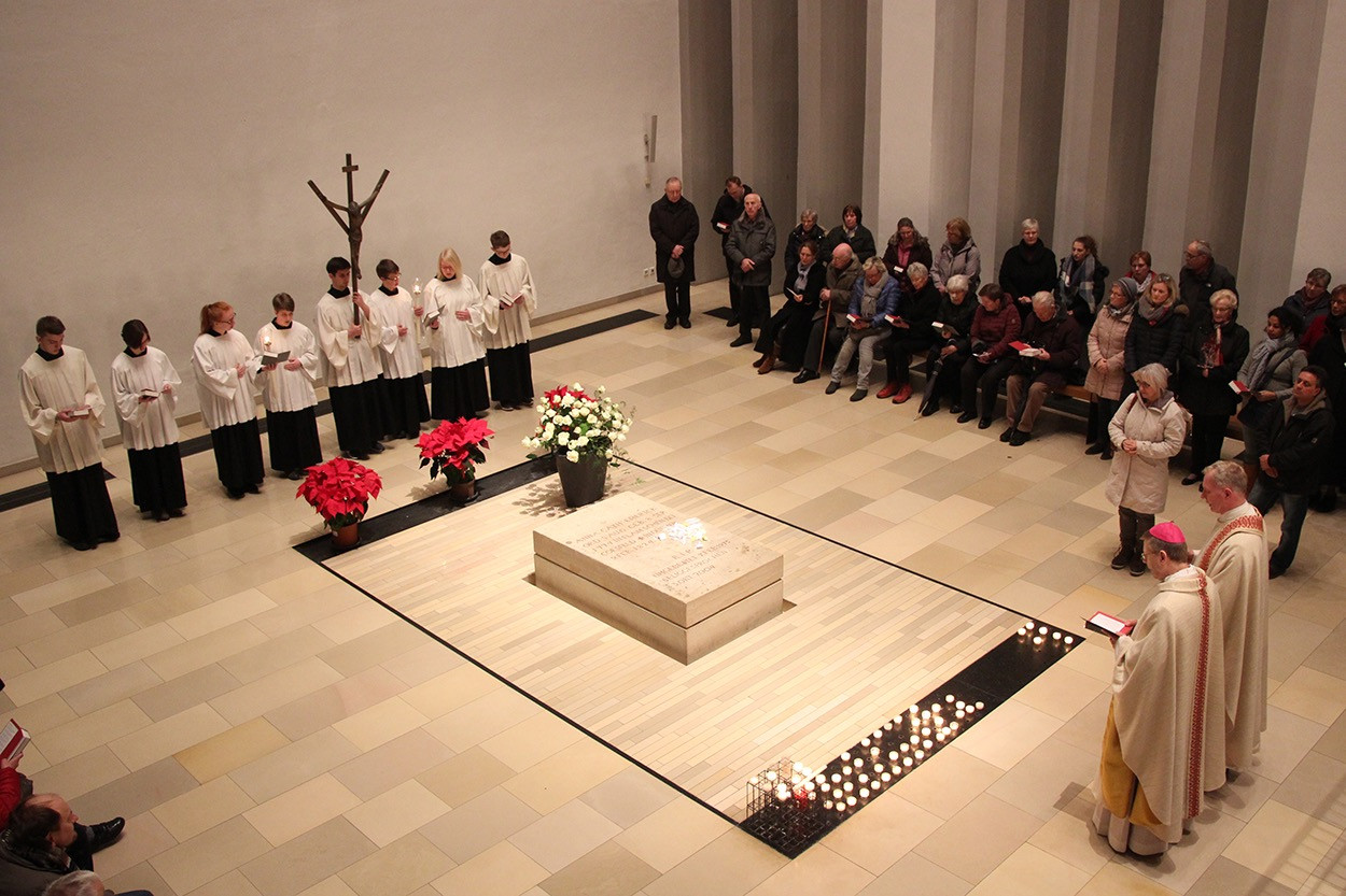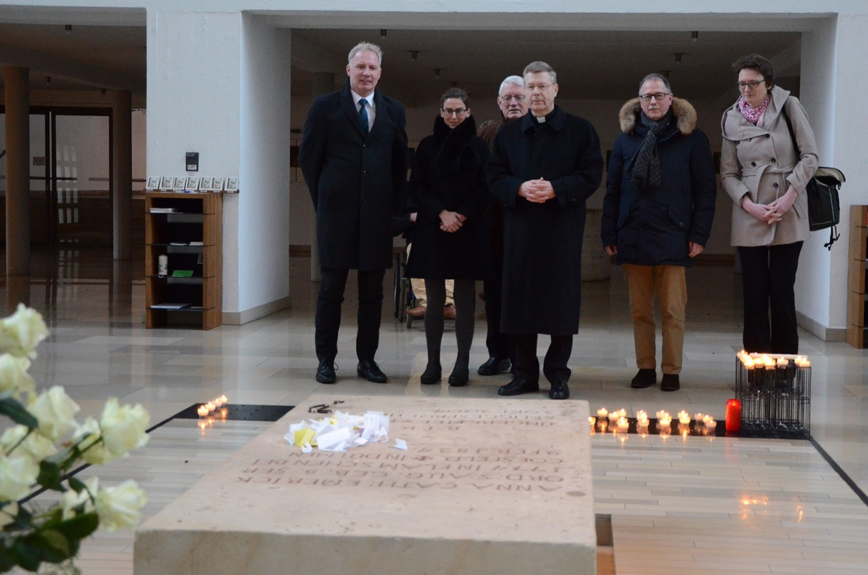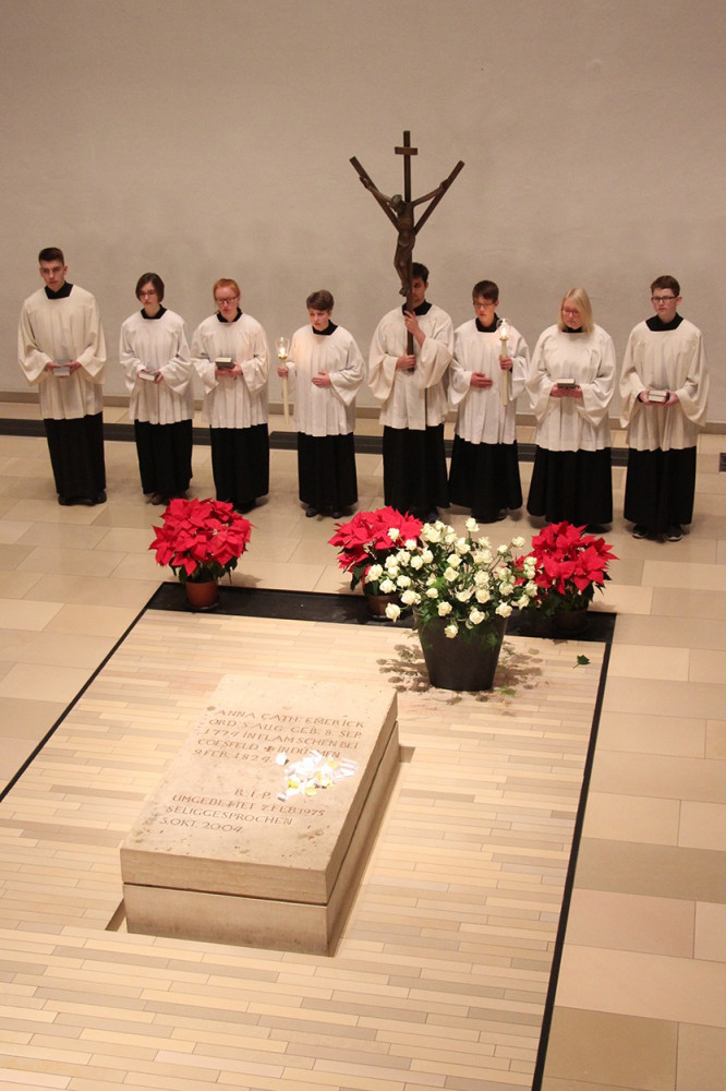 Eine Voraussetzung für eine mögliche Heiligsprechung der seligen Anna Katharina Emmerick ist erfüllt: die weltweite Verehrung. „Monatlich erreichen uns bis zu 50 Emails aus aller Welt“, berichtete Angela Pund, stellvertretende Vorsitzende des Emmerick-Bundes, Weihbischof Dr. Stefan Zekorn. Der Regionalbischof war am Gedenktag der Seligen (9. Februar) nach Dülmen gekommen. Auf dem Programm standen ein Gespräch mit den Aktiven des Emmerick-Bundes sowie eine Eucharistiefeier in der Heilig-Kreuz-Kirche mit anschließender Prozession zum Grab der Seligen, das sich in der Kirche befindet.