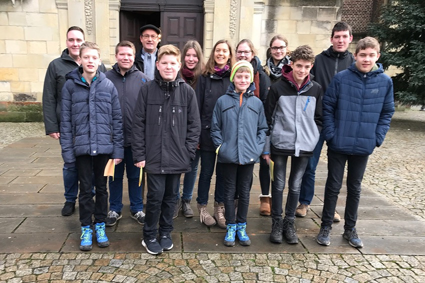 Zwölf junge Leute machten sich am 2. Januar frühmorgens mit der Bahn auf den Weg von Dülmen nach Coesfeld, um zusammen mit Pfarrer Markus Trautmann an einem Einkehrtag teilzunehmen. Bei der Vormittagsrunde im Pfarrheim der Coesfelder Kirchengemeinde St. Lamberti stand die Betrachtung einer Grafik von Beate Heinen im Mittelpunkt: Krippe und Kreuz auf ein und derselben Darstellung, dazwischen Menschen auf dem Weg.
