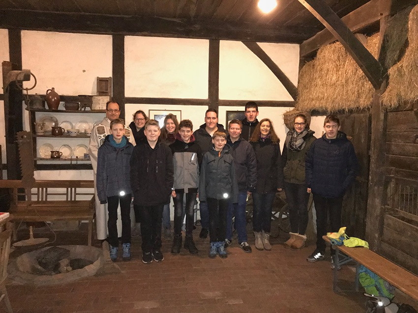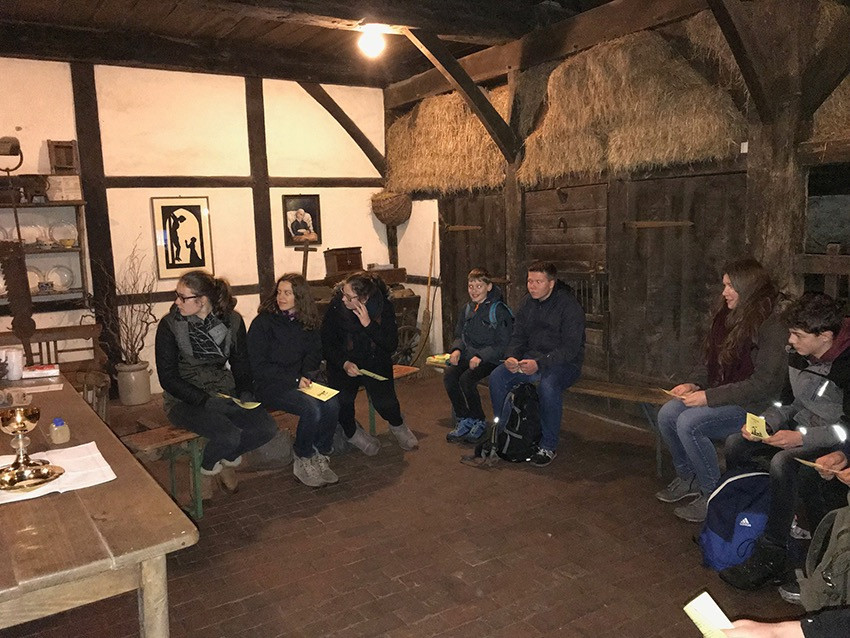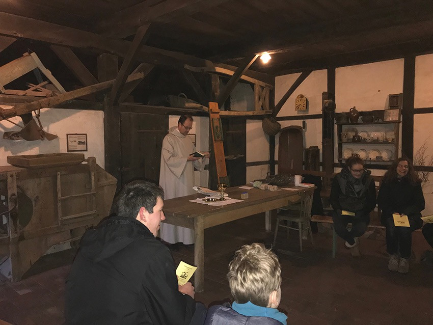 In der anschließenden längeren Betrachtung waren alle Teilnehmenden eingeladen, am „Coesfelder Kreuz“ in der nahen Lambertikirche für eine längere Zeit zur Ruhe zu kommen und die in diesem historischen Kunstwerk dargestellte Hingabe Jesu zu bedenken – wie einst die junge Anna Katharina Emmerick. Zu deren Geburtshaus nach Flamschen führte nach dem Mittagessen eine Winterwanderung entlang der Berkel. Hier feierte die Gruppe in der stimmungsvollen Atmosphäre der Gedenkstätte eine heilige Messe, bevor es dann, gestärkt von heißem Punsch, zu Fuß zum Bahnhof Lette weiterging, um von hier per Bahn die Heimfahrt nach Dülmen anzutreten.